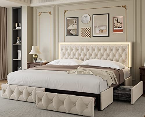 Buy Keyluv Queen Upholstered LED Bed Frame with 4 Drawers, Velvet Platform Storage Bed with Adjustable Button Tufted Headboard and Solid Wooden Slats Support, No Box Spring Needed, Beige: Bed Frames – ✓ FREE DELIVERY possible on eligible purchases